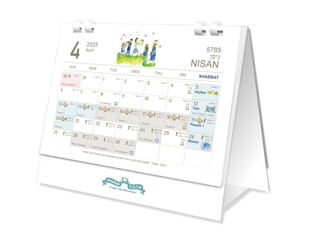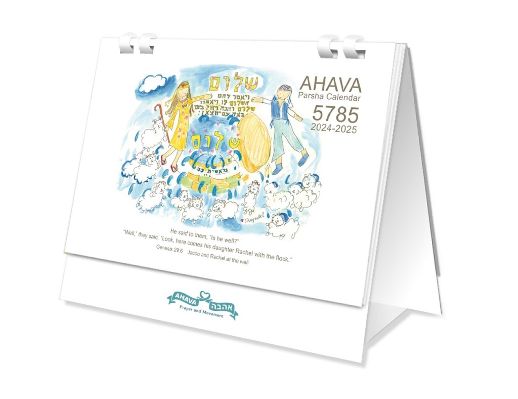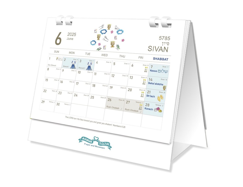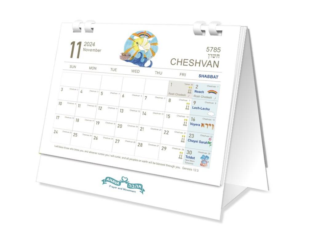 You will find it fun and lively to open each new month with hand-drawn icons on all the special days to go with our AHAVA Prayer Sheets. Our calendar is family-friendly and specially designed so you can `link` to our AHAVA Prayer sheets using the barcode logo on the back; Find the whole year of Prayer sheets on our website to go with each weekly Torah portion to pray for your family and Israel.